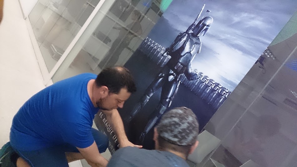 Dani Caran y Kiko poniendo un póster promocional auténtico del Episodio II con Jango Fett y los clones como reclamo |