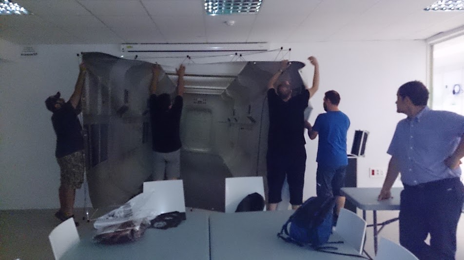 Van llegando los organizadores a media tarde, haciendo caso omiso del calor tatooinesco que acecha ahí fuera en las calles de Alicante, llegamos al centro Las Cigarreras, descargamos todo el material preparado en el maletero de los coches y decidimos empezamos primero por lo más pesado: un cacharro que ha sido apodado cariñosamente como la «Estrella de la Muerte»: el soporte del photocall. Dani Caran, Carolina Moreno, Marco Oso, Kiko Kiakuma y Paco Villa se ponen manos a la obra: