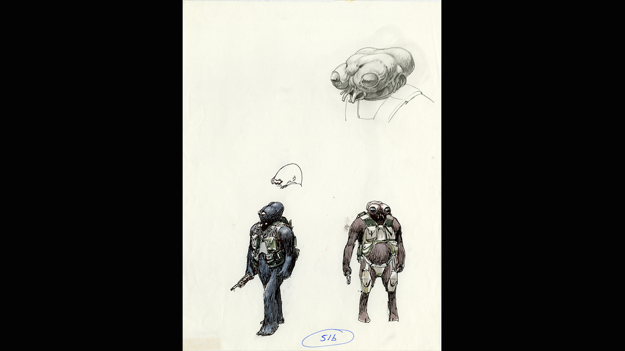McQuarrie siempre con nosotros: El diseño del jefe Yushyn esta basado en el boceto de un cazarrecompensas alien que hizo Ralph McQuarrie para «El Imperio Contraataca».