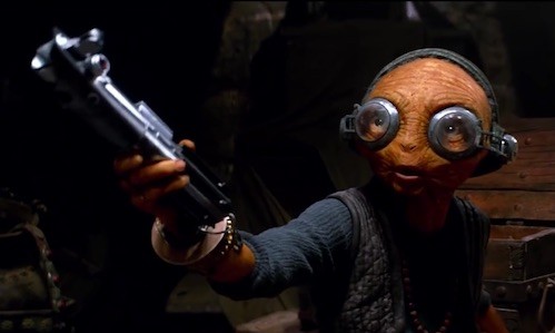 «Ahora puedo contar que en la escena de apertura original del Episodio VII, la primera cosa que aparecía era una mano con un sable de luz, una mano cortada que entra en la atmósfera y luego la mano arde y se hunde en la superficie de Jakku. Esta mano alien viene, no sé si era Maz pero era una mano alien que toma la forma del sable, y luego empieza la película que vimos.»