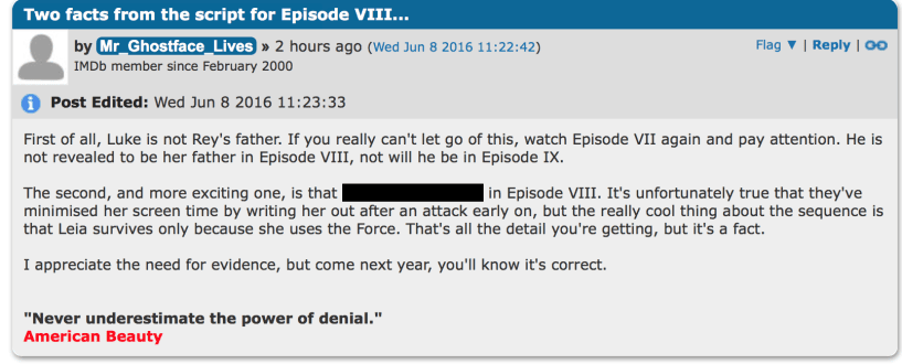 Estos rumores vienen de los foros de IMDB en los que el usuario Mr_Ghostfast_ Lives, que ya dio a conocer detalles superficiales de El Despertar de la Fuerza antes de su estreno, nos comenta estas cosas: