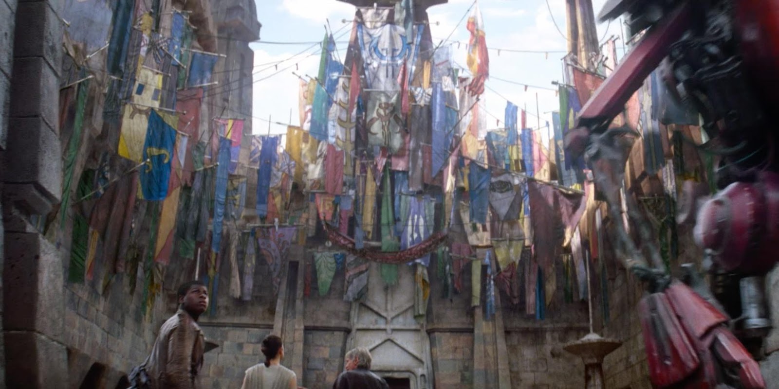 La norma parece simple, pero no es fácil acatarla, porque el castillo de Maz Kanata ha sido un lugar de reunión desde tiempos inmemoriales, un nexo que une a incontables alianzas y oposiciones, un lugar donde no solo los amigos y enemigos pueden reunirse, sino donde conflictos con gran complejidad se atenúan para que todos puedan sentarse, tomar un trago y comer, escuchar una canción, y negociar cualquier acuerdo que su situación sentimental o política requiera. Por eso es que las banderas desplegadas afuera del castillo representan los cientos de ciudades o civilizaciones o gremios que han existido desde siempre. La galaxia no es ahora, ni ha sido nunca, tan solo dos fuerzas opuestas peleando por la supremacía. Han sido miles de fuerzas: un estira y afloja no solo con una sola cuerda sino con una red de influencias, dominación y deseos. Los clanes y los cultos, las tribus y las familias, los gobiernos y los anti-gobiernos. ¡Reinas, sátrapas, señores de la guerra! ¡Diplomáticos, piratas, droides! ¡Informáticos, vendedores de especias, excursionistas y jugadores! Repito: TODOS SON BIENVENIDOS (NO PELEAR).
