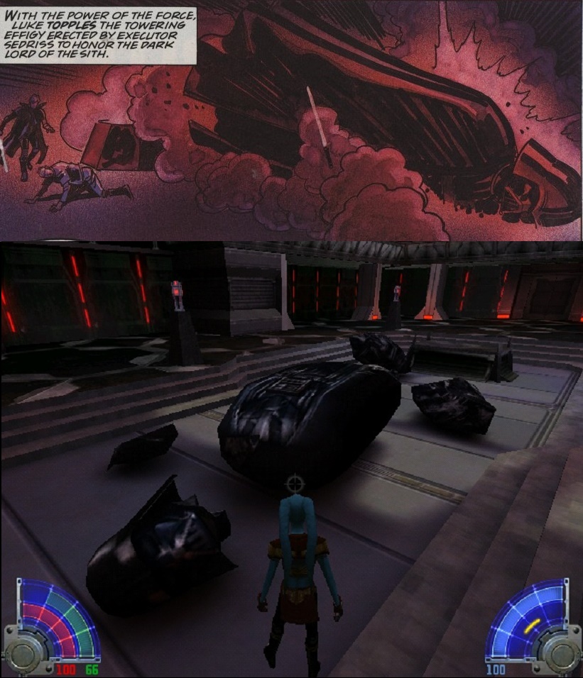 | En El Fin del Imperio Luke derriba una estatua de Darth Vader para derrotar a unos acólitos del Lado Oscuro en el planeta Vjun. En el videojuego Jedi Knight: Jedi Academy (2003) visitamos ese mismo escenario, años después, en el que vemos la estatua derribada. |