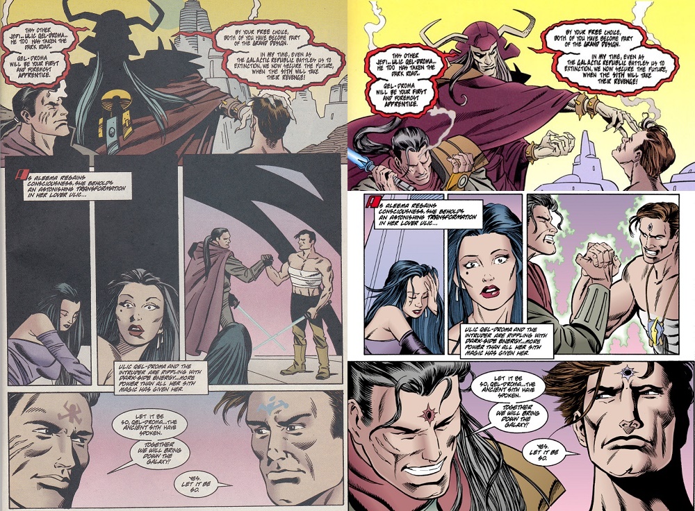 LFDR: Una duda que hemos tenido durante años y cuya respuesta hemos sido incapaces de encontrar en internet: En el ultimo número de Lores Oscuros del Sith (específicamente en la escena en la que los Antiguos Sith nombran a Exar Kun y a Ulic Qel Droma como herederos del legado Sith) la última página tiene un dibujo distinto que en la versión del tomo recopilatorio. ¿Sabe por qué fue esto así? ¿Por qué hay dos páginas distintas de la misma serie, una en el sexto número y otra en el formato tomo?