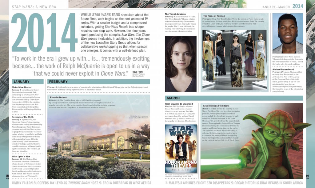 Si una imagen vale más que mil palabras, entonces las novedades de este mes de DK Publishing valen su peso en holocrones Jedi. Abriendo el mes está el libraco por excelencia, Star Wars Año a Año: Una Historia Visual, Edición Actualizada, que sale hoy. Esta nueva versión añade nuevas secciones a la impresionante línea temporal de nuestro mundo de Star Wars, desde la cultura que dio forma a George Lucas como un hombre joven hasta el año 2016. Al igual que el resto del libro, cuya primera edición salió en 2010, estas nuevas entradas, escritas por Pablo Hidalgo y a menudo usando arte, fotos y otras ilustraciones, llevan al lector a través de todos los acontecimientos claves en la historia reciente de la saga de Star Wars, incluyendo el desarrollo de El Despertar de la Fuerza y otras nuevas películas nuevas.