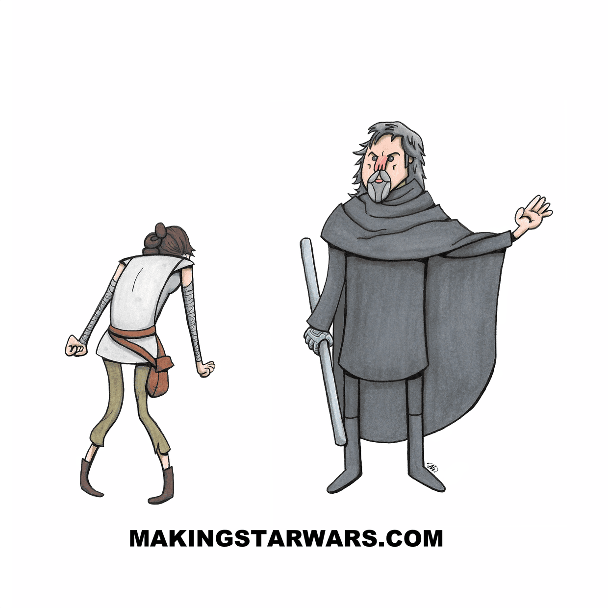 Según la web, la secuencia que representa el dibujo que os mostraremos a continuación, pertenece a una del entrenamiento de Rey, donde ella se siente frustrada con las enseñanzas de Luke. En la imagen, podréis ver a Luke con su mano robótica, aunque afirman no saber con exactitud si en esta escena llevará un guante negro o llevará la mano al descubierto como en «El Despertar de la Fuerza». Otro apunte, es que en esta escena Luke no portaría un sable de luz, pero sí, una especie de bastón o pica, y además, comentan, que este atuendo lo llevaría en las escenas de lluvia junto a Rey.