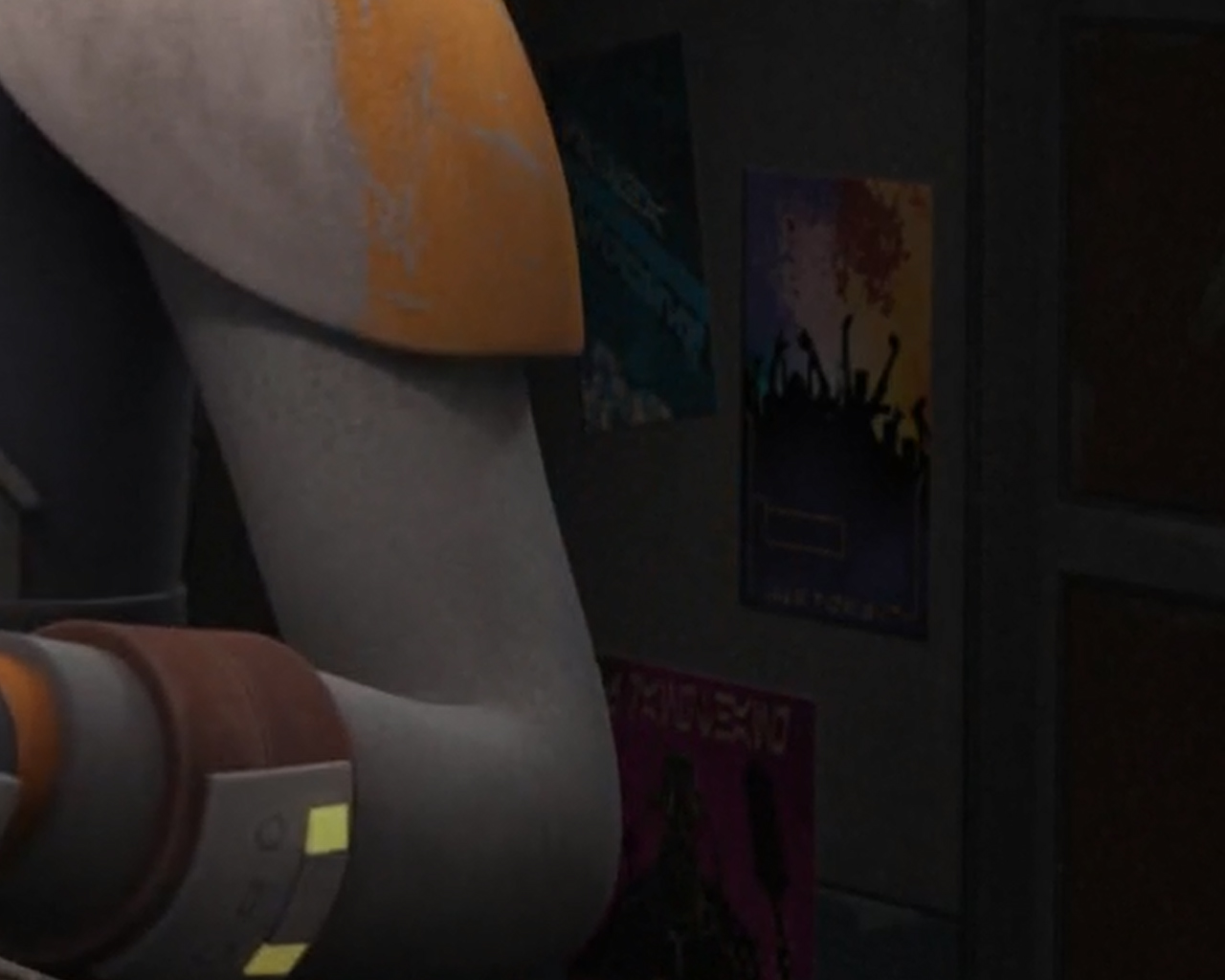 Cartelicos: En este episodio hemos podido discernir cuatro posters mas dentro de la «Espíritu» un poster sobre «Max Reebo» El cual o es otro o ha sido un error ya que siempre ha sido «MaxRebo» otro cartel sobre el cantante Twi’Lek «Dasha Sigweed» y este es rebuscado de narices, ya que este personaje solo ha aparecido en posters muy de pasada en Clone Wars y en un articulo del blog de StarWars.com «Slugthrowers: An Overview of Popular Music and Musicians in a Galaxy Far, Far Away» este nombre vine de una broma hacia los DJ Ingleses «Sasha & John Digweed» otro poster esta dedicado a otro DJ que aparece en la serie Clone Wars «DJ Rangthang» el último cartel no he sido capaz de descifrar bien las letras en Aurebesh ni si quiera en 1080, si hay algún valiente con mejor vista, que lo añada en comentarios.