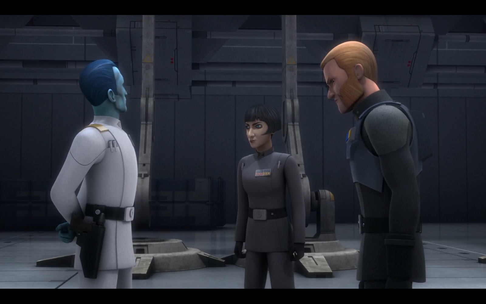 El Arte de Thrawn: En la escena que le vemos admirando información de los Rebeldes, podemos distinguir varias cosas, empezando desde la espalda de Thrawn en el sentido contrario a las agujas del reloj mirando la imagen mas abajo podemos ver, la mascara de Guardián del Templo Jedi de Kanan, el Ave Fénix de Sabine, el Guernica Mandaloriano que pudimos ver en la serie Clone Wars en la sala del trono de Concordia, la luna de Mandalore, La ficha de Ezra cuando se hacia llamar «Dev Morgan» en el episodio «Breaking Ranks», una Imagen de la madre de Hera, la Profecía de los Tres de los Lasat, un grafiti de un Lothcat, la familia Syndulla, símbolos del Templo Jedi de Lothal. una estatua Bardottiana que tiene como decoración en el despacho, esa estatua la pudimos ver en la sexta temporada de Clone Wars en el planeta Bardotta que visitan Jar Jar Binks y Mace Windu, y para terminar el Kalikori de Hera.